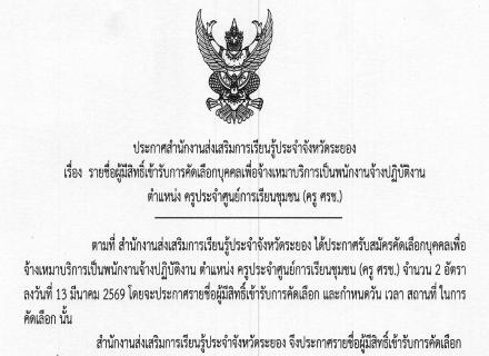 ประกาศรายชื่อผู้มีสิทธิ์เข้ารับการคัดเลือกบุคคลเพื่อจ้างเหมาบริการเป็นพนักงานจ้างปฏิบัติงาน ตำแหน่ง ครูประจำศูนย์การเรียนรู้ชุมชน (ครู ศรช.)