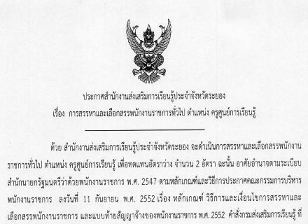 ประกาศการสรรหาและเลือกสรรพนักงานราชการทั่วไป ตำแหน่ง ครูศูนย์การเรียนรู้