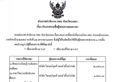 ประกาศสำนักงาน กศน. จังหวัดระยอง รายชื่อผู้ชนะการเสนอราคา