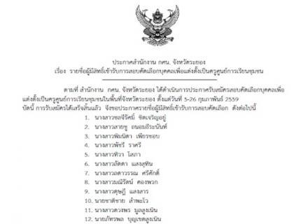 ประกาศรายชื่อผู้ผ่านการสอบคัดเลือกเพื่อแต่งตั้งเป็นครูศูนย์การเรียนรู้ชุมชน ในจังหวัดระยอง