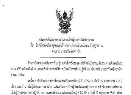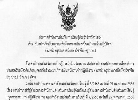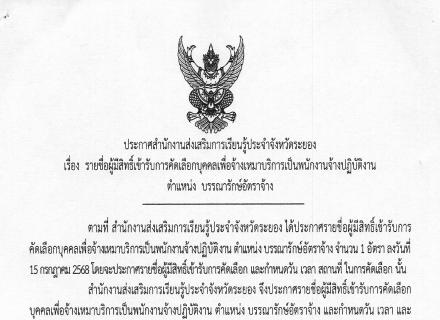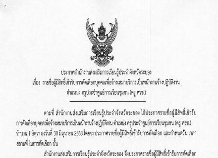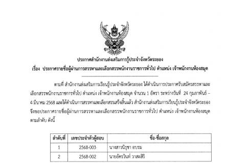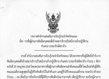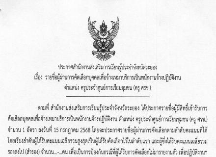 สำนักงานส่งเสริมการเรียนรู้ประจำจังหวัดระยอง แจ้งประกาศรายชื่อผู้ผ่านการคัดเลือกบุคคลเพื่อจ้างเหมาบริการเป็นพนักงานจ้างปฏิบัติงาน ตำแหน่งบรรณารักษ์อัตราจ้าง ให้มารายงานตัวในวันที่ 16 มิถุนายน 2568 เวลา 08.30 น. ณ สำนักงานส่งเสริมการเรียนรู้ประจำจังหวัดระ
