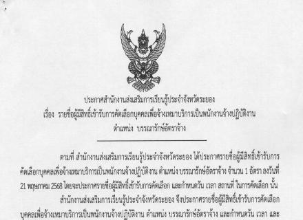ประกาศรายชื่อผู้ผ่านการสรรหาและเลือกสรรพนักงานราชการทั่วไป ตำแหน่ง เจ้าพนักงานห้องสมุด