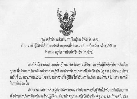 ประกาศรายชื่อผู้มีสิทธิ์เข้ารับการคัดเลือกบุคคลเพื่อจ้างเหมาบริการเป็นพนักงานจ้างปฏิบัติงาน ตำแหน่ง ครูประจำศูนย์การเรียนชุมชน (ครู ศรช.)