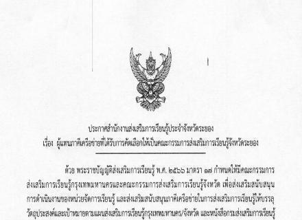 ประกาศบัญชีรายชื่อผู้แทนภาคีเครือข่ายที่ได้รับการคัดเลือกให้เป็นคณะกรรมการส่งเสริมการเรียนรู้จังหวัดระยองให้ทราบโดยทั่วกัน เพื่อเปิดรับฟังข้อทักท้วง ตั้งแต่วันที่ 20 มิ.ย. ถึง 4 ก.ค. 2568 โดยแจ้งได้ที่ (1) โทรศัพท์ 038-617317 (2) Email nferayong@gmail.com
