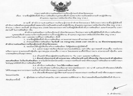 สำนักงานส่งเสริมการเรียนรู้ประจำจังหวัดระยอง ขอประกาศรายชื่อผู้มีสิทธิ์เข้ารับการคัดเลือกบุคคลเพื่อจ้างเหมาบริการเป็นพนักงานจ้างปฏิบัติงาน ตำแหน่ง ครูประกาศนียบัตรวิชาชีพ (ครู ปวช.) กำหนดการคัดเลือกในวันที่ 16 กรกฎาคม 2568 เวลา 09.00 น. ณ ห้องประชุมสุนทรภ