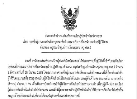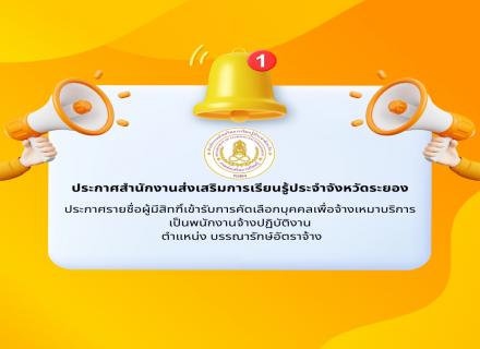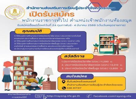 สำนักงานส่งเสริมการเรียนรู้ประจำจังหวัดระยอง  ประกาศการสรรหาและเลือกสรรพนักงานราชการทั่วไป ตำแหน่ง นิติกร กำหนดรับสมัครตั้งแต่วันที่ 29 พฤศจิกายน - 6 ธันวาคม 2567  สามารถยื่นใบสมัครด้วยตนเองได้ที่สำนักงานส่งเสริมการเรียนรู้ประจำจังหวัดะรอยง ภาคเช้า เวลา 0					 |