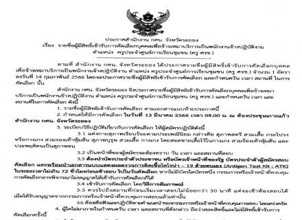 สำนักงานส่งเสริมการเรียนรู้จังหวัดระยอง ขอประกาศรายชื่อผู้มีสิทธิ์เข้ารับการคัดเลือกบุคคลเพื่อจ้างเหมาบริการเป็นพนักงานจ้างปฏิบัติงาน ตำแหน่ง ครูประจำศูนย์การเรียนชุมชน (ศรช.) ในวันที่ 17 กรกฎาคม 2566