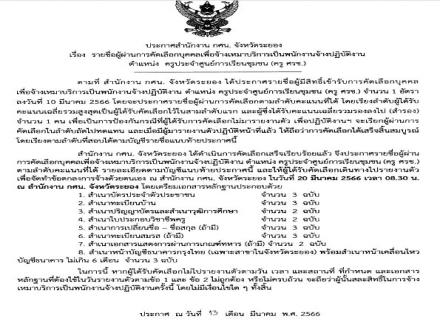 ประกาศรายชื่อผู้มีสิทธิ์เข้ารับการสรรหาและเลือกสรรพนักงานราชการทั่วไป ตำแหน่ง ครู กศน.ตำบล